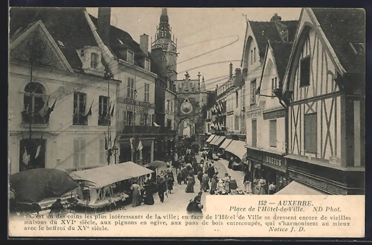 AK Auxerre, Place de l`Hôtel-de-Ville avec maisons anciennes et beffroi du XVe siècle
