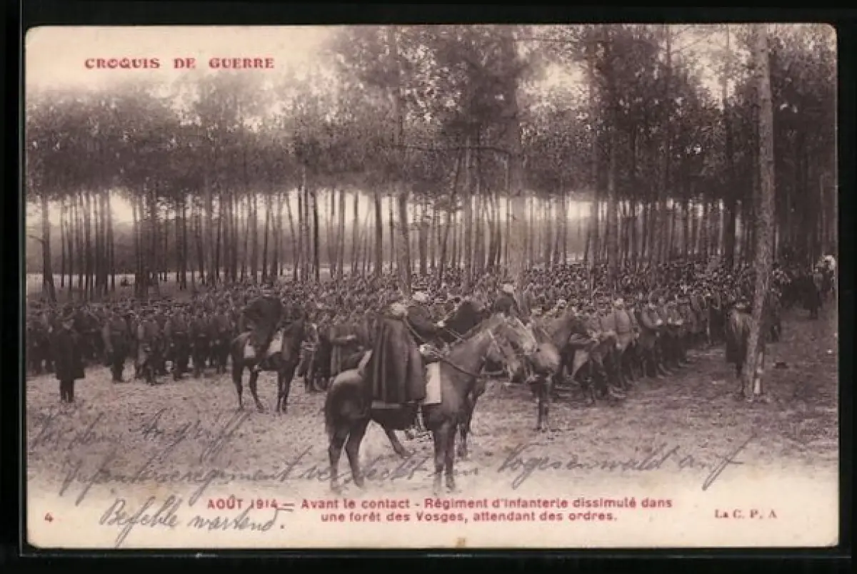 AK Avant le contact, Régiment d`Infanterie dissimulé dans une foret des Vosges, Aout 1914, Croquis de Guerre