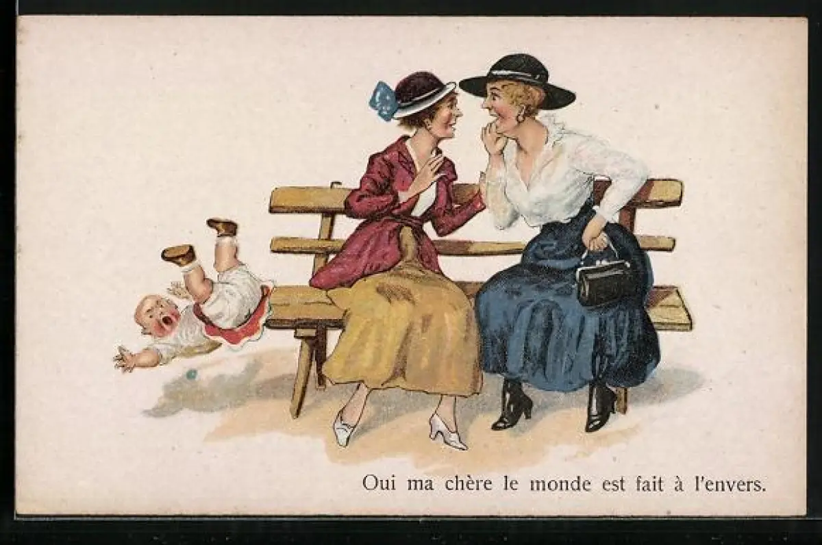 AK Baby fällt von der Bank, während sich die Mutter angeregt mit einer Frau unterhält