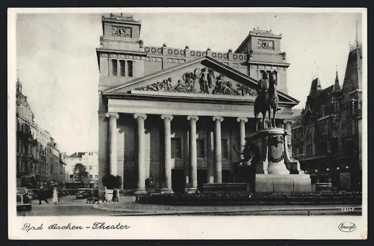 AK Bad Aachen, Frontansicht des Theaters mit Denkmal