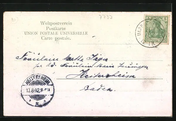 gelaufen 1902, minimale Einrisse li. oben und unten und re. oben, guter Zustand