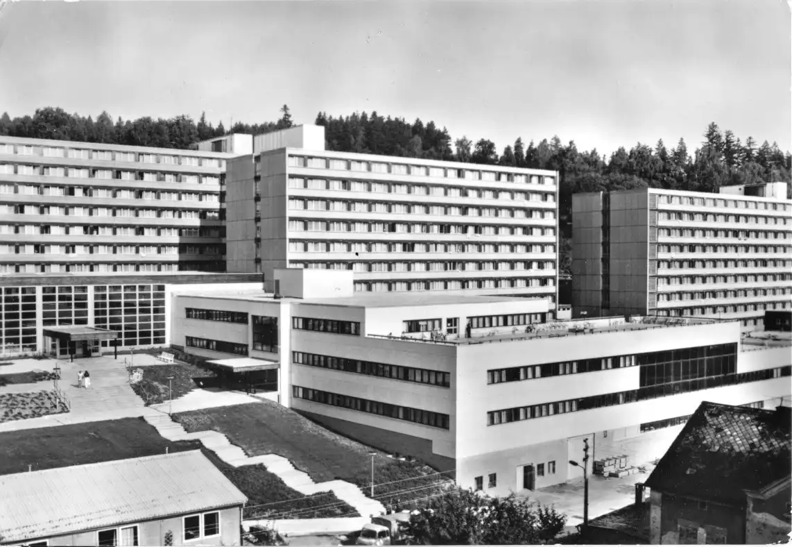 Ansichtskarte Bad Elster Neubau Therapiegebäude und Bettenhäuser Erhaltung I-II postalisch gelaufen, gestempelt: Bad Elster, 3.11.87 Druckvermerk: 1985 Herstellungsland: DDR Verlag: Bild und Heimat, Reichenbach - 01 14 13 245