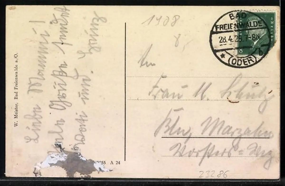 Personenbezogene Daten auf der Rückseite der Karte wurden durch blauen Textmarker unkenntlich gemacht. Die blauen Stellen sind auf die Vorderseite durchgeweicht und wirken sich negativ auf das Postkartenfoto aus