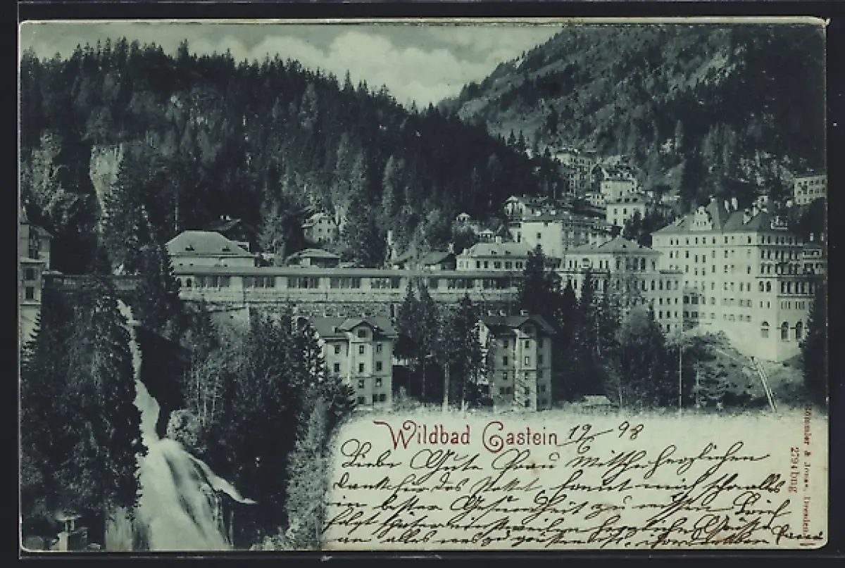 AK Bad Gastein, Ortspanorama mit Wasserfall