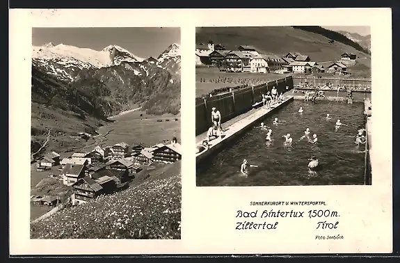 AK Bad Hintertux, Freibad mit Badegästen und Ortsansicht aus der Vogelschau
