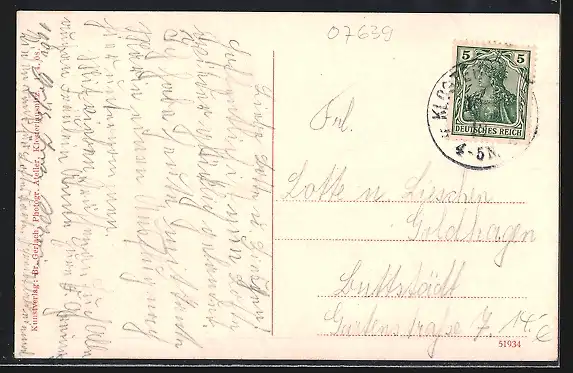 Personenbezogene Daten auf der Rückseite der Karte wurden durch blauen Textmarker unkenntlich gemacht. Die blauen Stellen sind auf die Vorderseite durchgeweicht und wirken sich negativ auf das Postkartenfoto aus