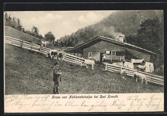 AK Bad Kreuth, Vieh auf der Hohensteinalpe vor einer Hütte