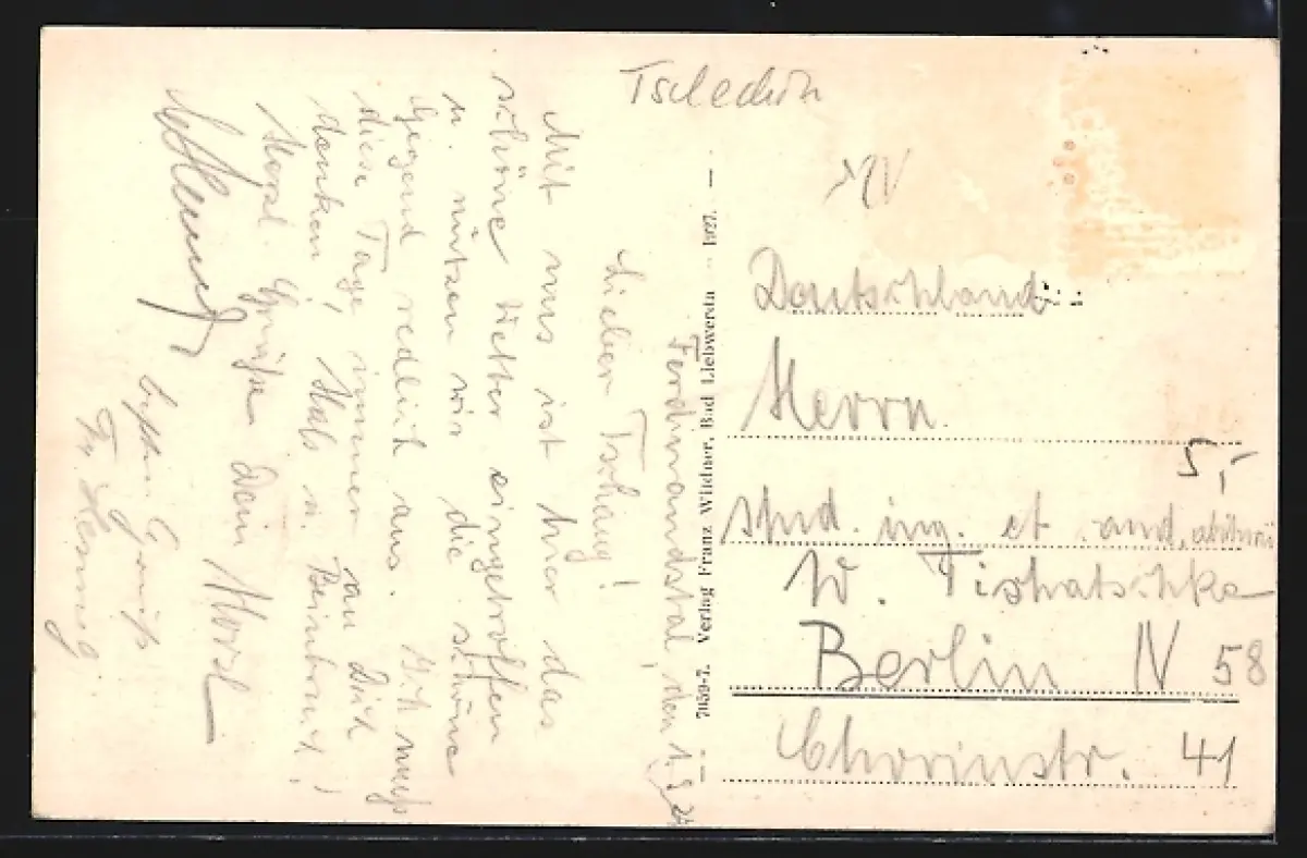 Personenbezogene Daten auf der Rückseite der Karte wurden durch blauen Textmarker unkenntlich gemacht. Die blauen Stellen sind auf die Vorderseite durchgeweicht und wirken sich negativ auf das Postkartenfoto aus