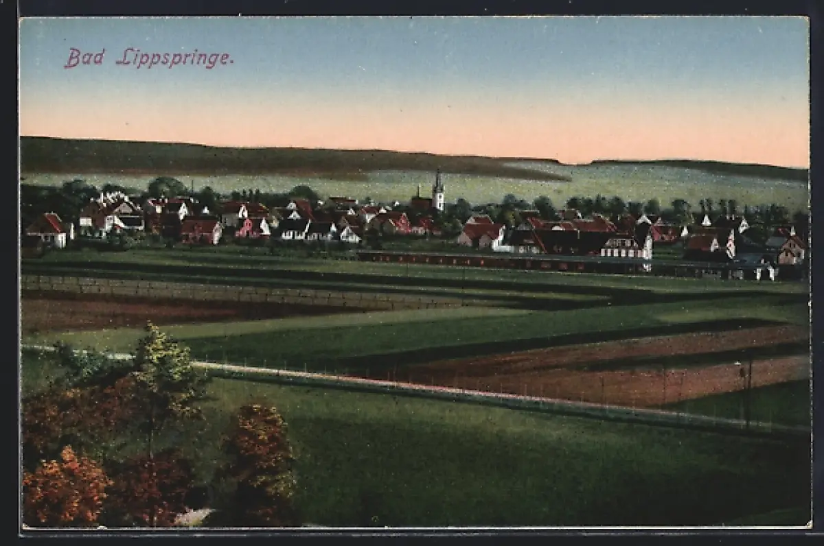 AK Bad Lippspringe, Ortsansicht, Felder, Kirche