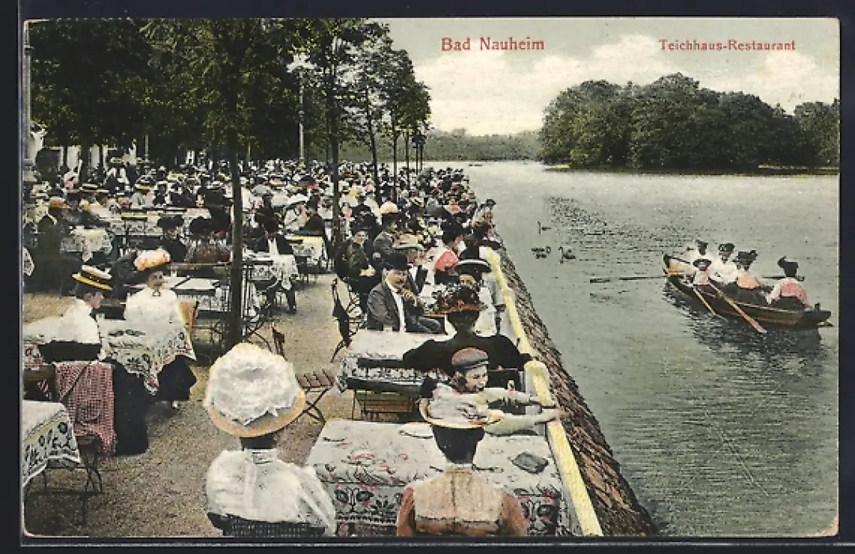AK Bad Nauheim, Das Teichhaus-Restaurant, Ruderboot auf dem Wasser