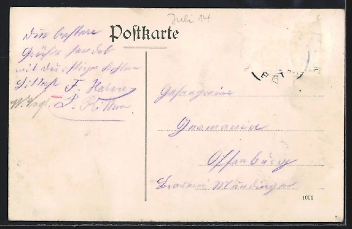 alte Ansichtskarte, gelaufen, Briefmarke entfernt, rückseitig Oberflächenschaden, Stempelspur, guter Zustand