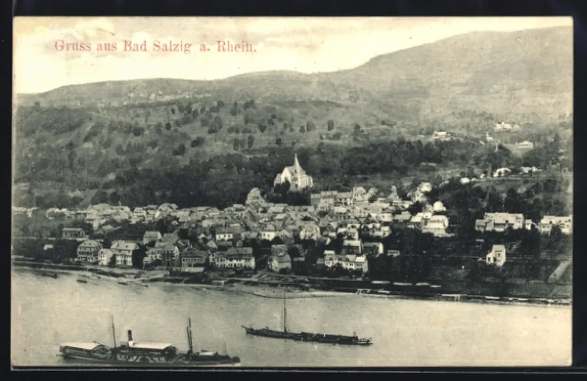 AK Bad Salzig a. Rhein, Ortsansicht mit Kirche und Rhein