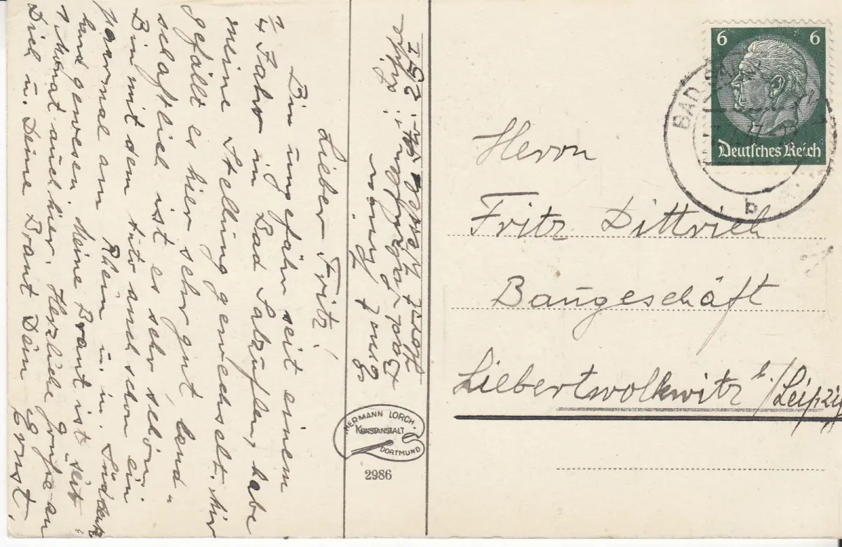Hermann Lorch, 1937. Karte, 9,0 x 14,0 cm