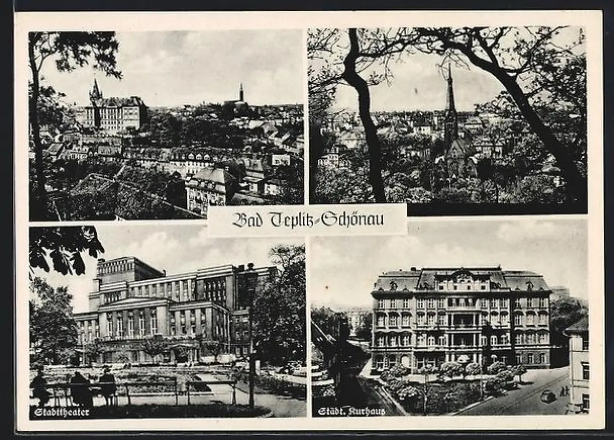 AK Bad Teplitz-Schönau, Städtisches Kurhaus, Stadttheater, Teilansicht mit Kirche