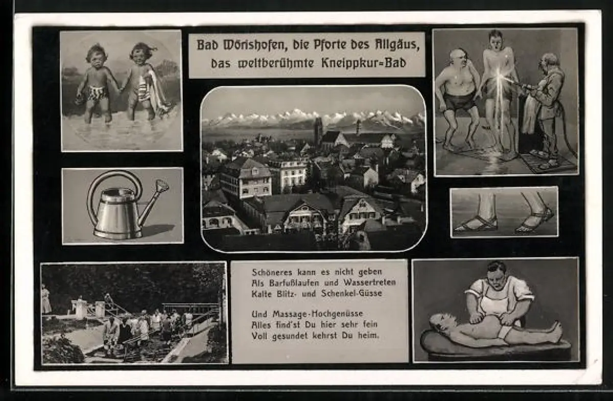 AK Bad Wörishofen /Allgäu, Ortsansicht, Gäste beim Wassertreten und Mann während Massage