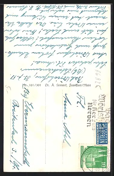 Personenbezogene Daten auf der Rückseite der Karte wurden durch blauen Textmarker unkenntlich gemacht. Die blauen Stellen sind auf die Vorderseite durchgeweicht und wirken sich negativ auf das Postkartenfoto aus