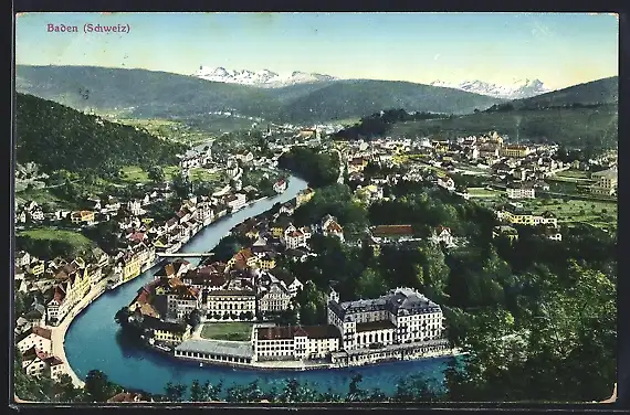 AK Baden, Ortsansicht mit Flusspartie aus der Vogelschau
