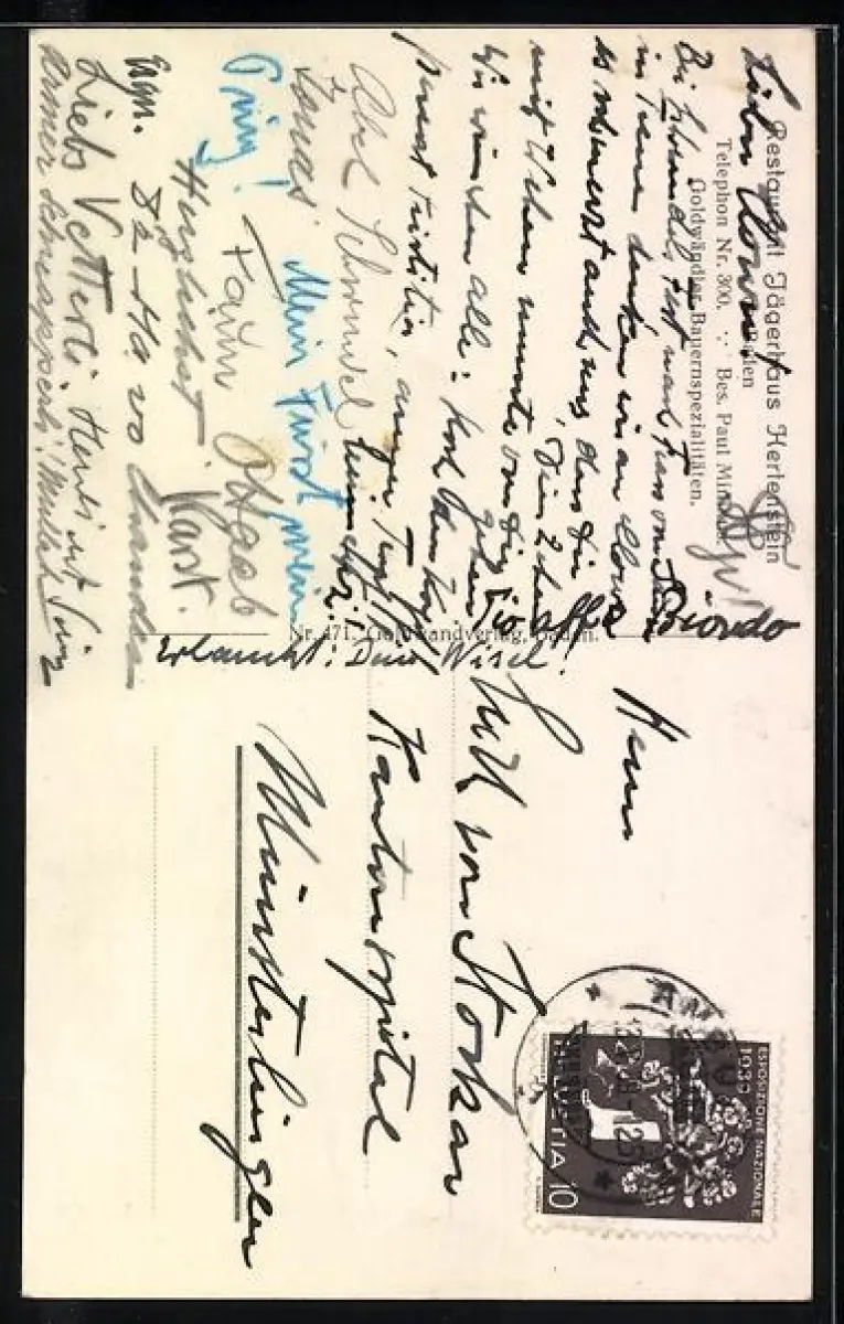 Personenbezogene Daten auf der Rückseite der Karte wurden durch blauen Textmarker unkenntlich gemacht. Die blauen Stellen sind auf die Vorderseite durchgeweicht und wirken sich negativ auf das Postkartenfoto aus