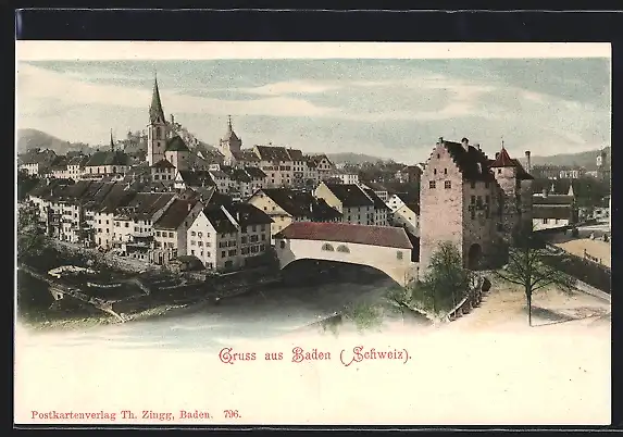 AK Baden, Teilansicht mit Brücke und Kirche