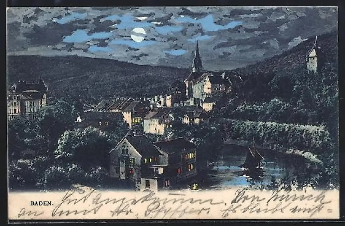 AK Baden, Teilansicht mit Flusspartie im Mondschein