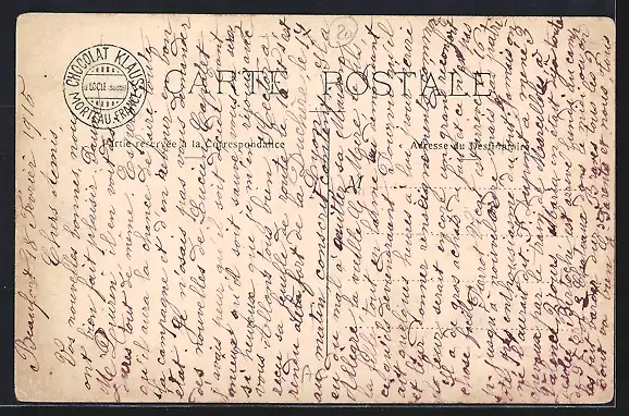 Personenbezogene Daten auf der Rückseite der Karte wurden durch blauen Textmarker unkenntlich gemacht. Die blauen Stellen sind auf die Vorderseite durchgeweicht und wirken sich negativ auf das Postkartenfoto aus
