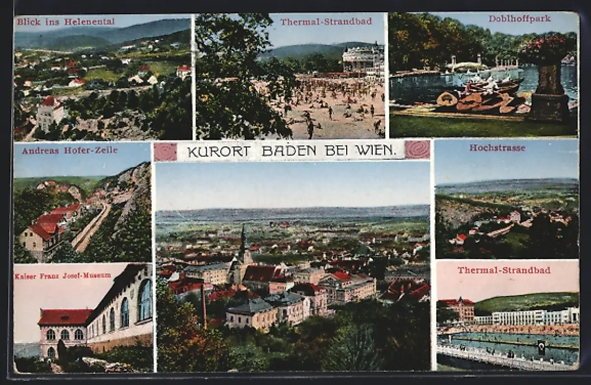 AK Baden bei Wien, Andreas Hofer-Zeile, Doblhoffpark, Hochstrasse, Thermal-Strandbad