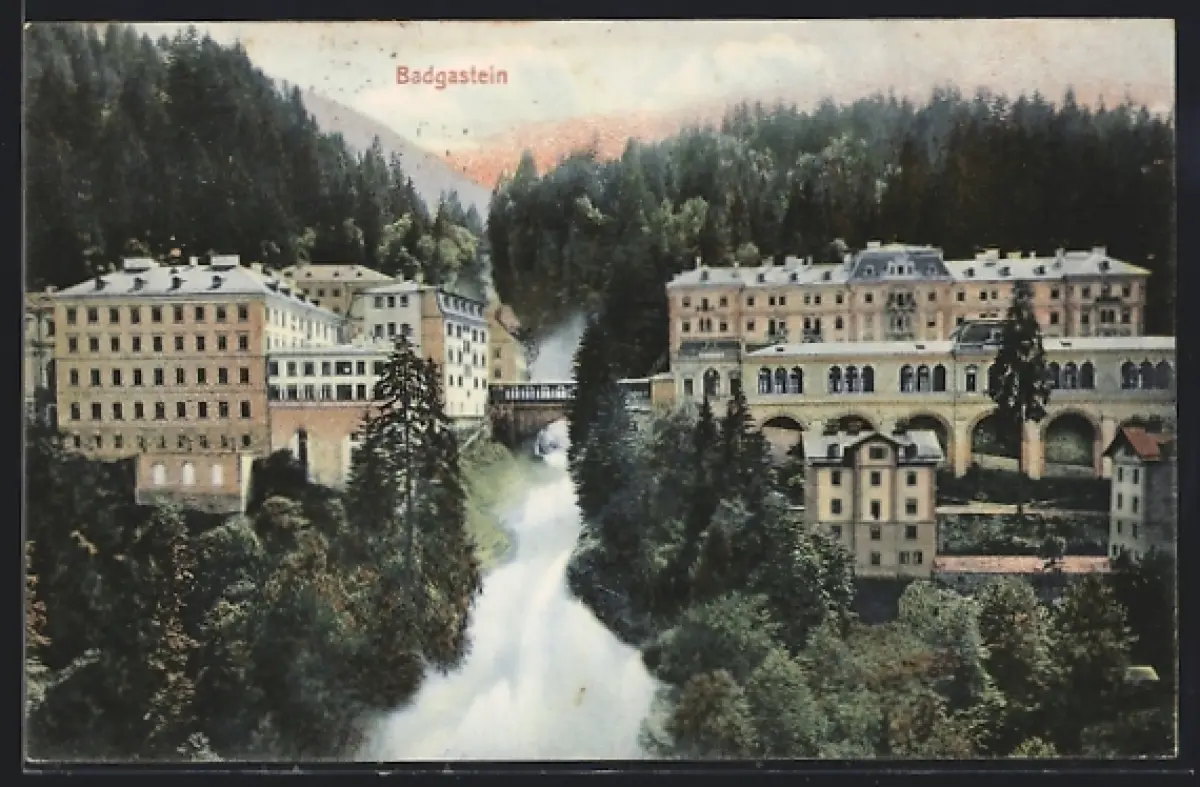 AK Badgastein, Gebäudeansicht mit Wasserfall