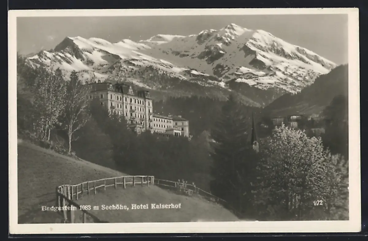 AK Badgastein, Hotel Kaiserhof mit verschneitem Gipfel