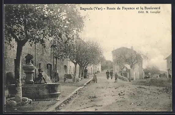 AK Bagnols, Route de Fayence et le Boulevard avec fontaine et passants