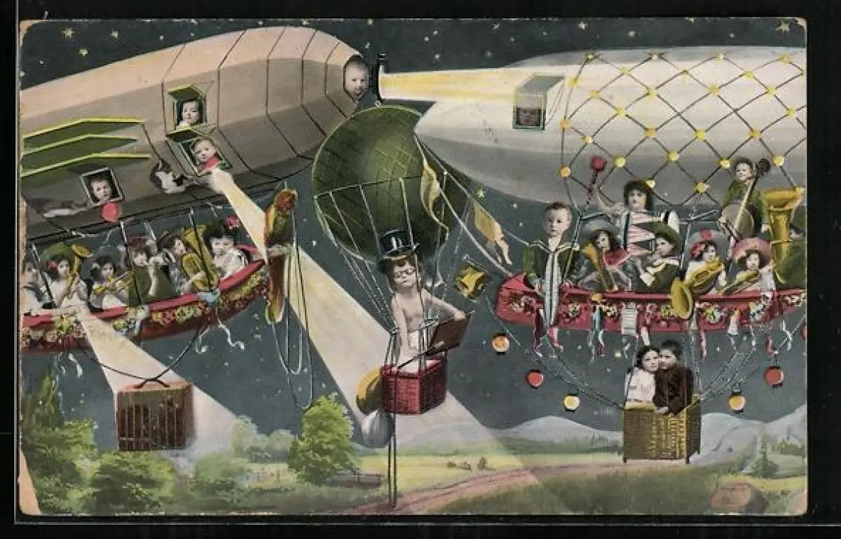 AK Ballon und zwei Zeppeline mit musizierenden Kindern in den Gondeln