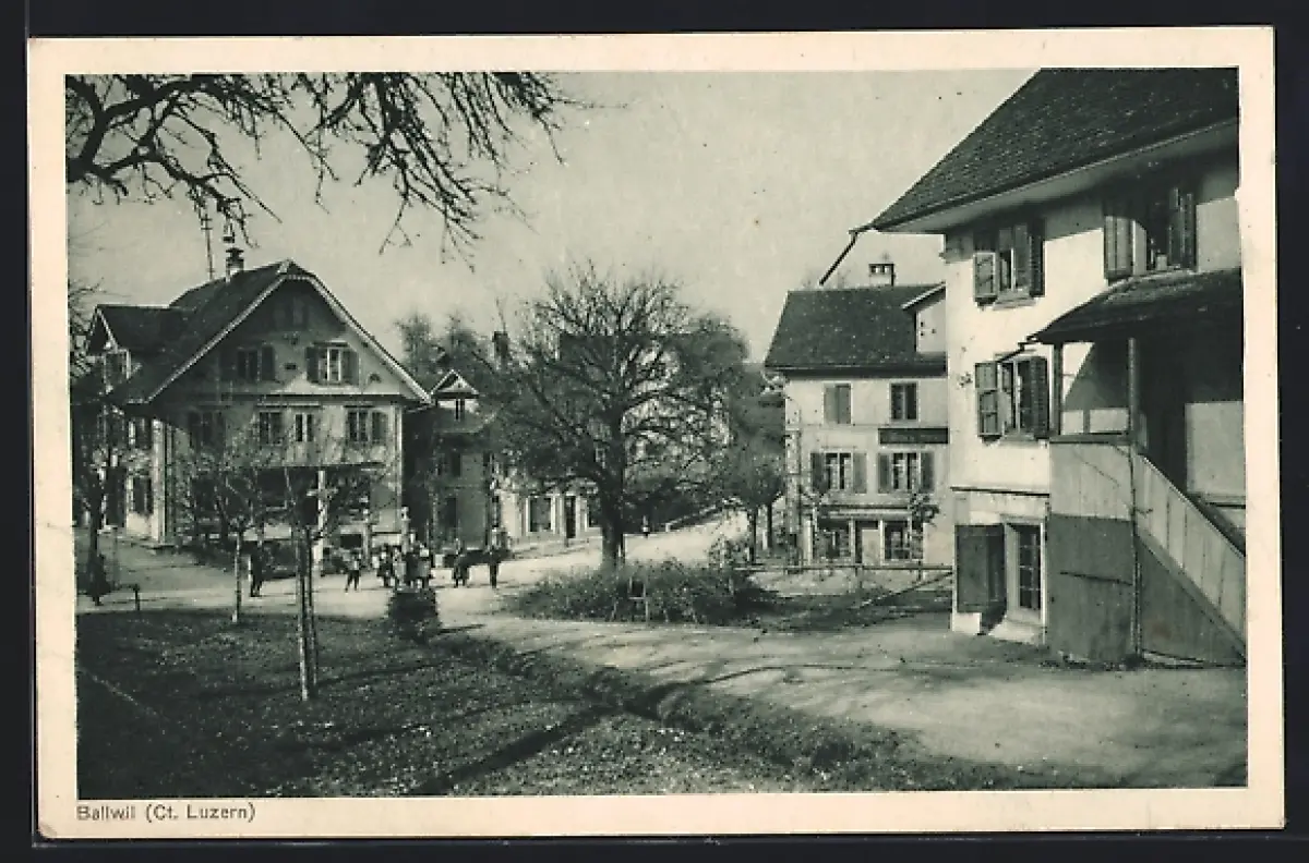 AK Ballwil /Luzern, Strassenpartie mit Denkmal