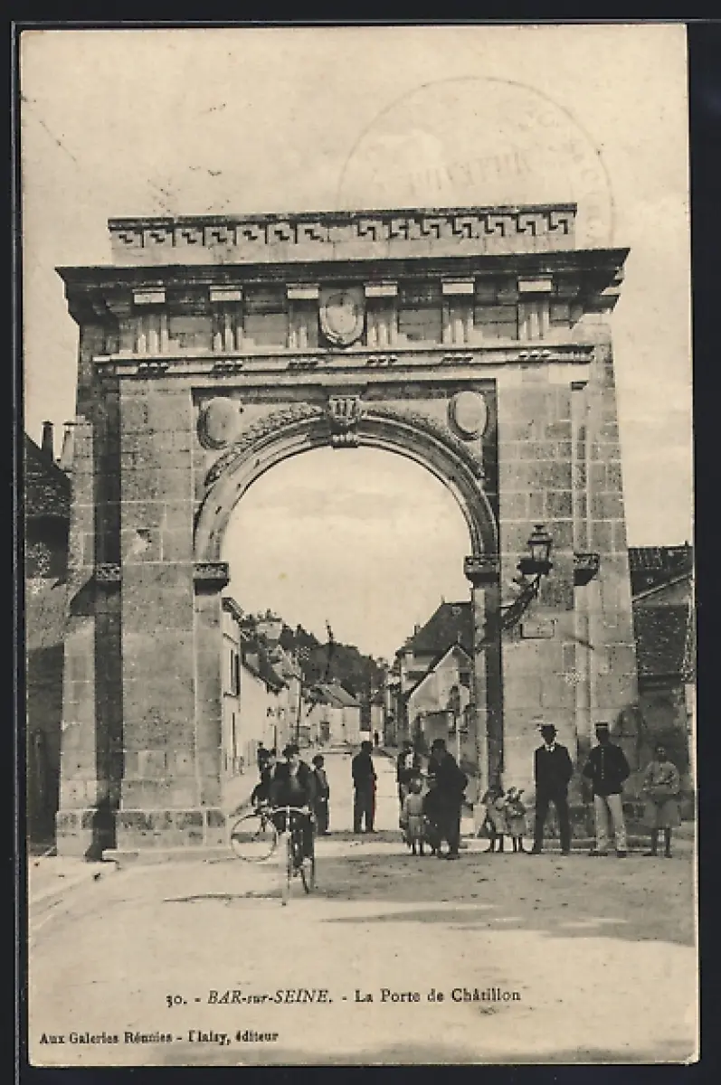 AK Bar-sur-Seine, La Porte de Châtillon avec des passants et un cycliste