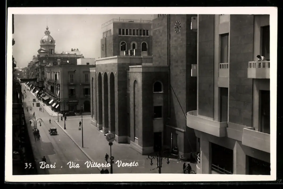 AK Bari, Via Vittorio Veneto con edifici storici e strada animata