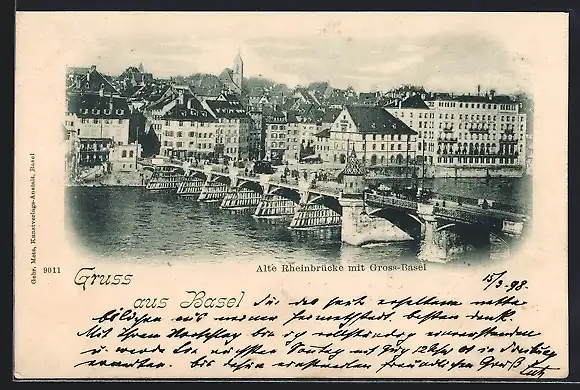 AK Basel, Alte Rheinbrücke mit Gross-Basel