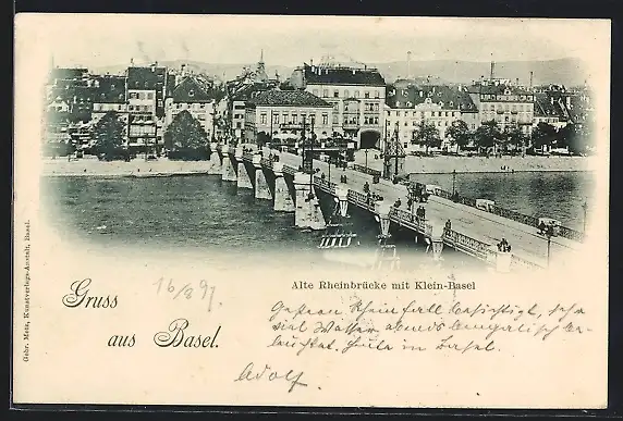 AK Basel, Alte Rheinbrücke mit Klein-Basel