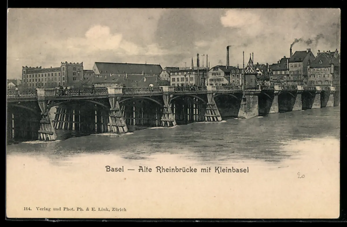 AK Basel, Alte Rheinbrücke mit Kleinbasel