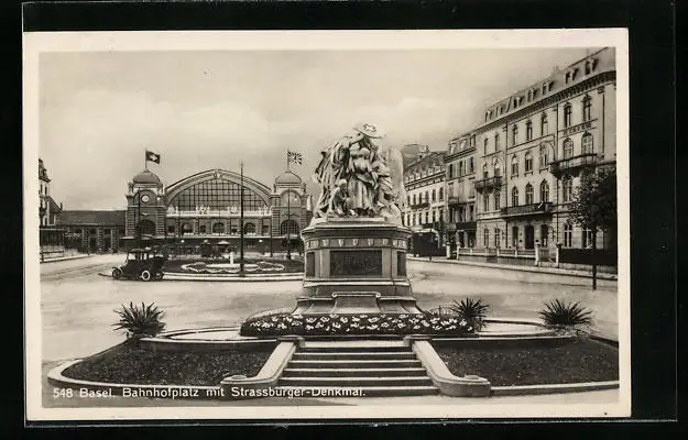 AK Basel, Bahnhofplatz mit Strassburger-Denkmal