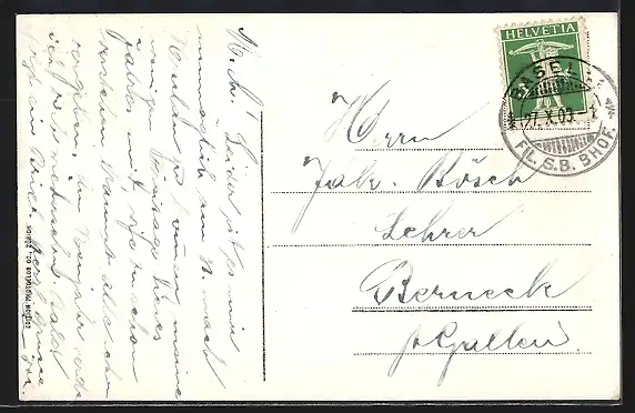 Personenbezogene Daten auf der Rückseite der Karte wurden durch blauen Textmarker unkenntlich gemacht. Die blauen Stellen sind auf die Vorderseite durchgeweicht und wirken sich negativ auf das Postkartenfoto aus
