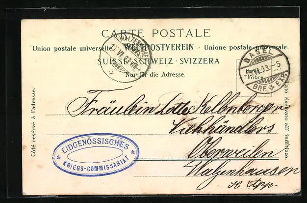 Personenbezogene Daten auf der Rückseite der Karte wurden durch blauen Textmarker unkenntlich gemacht. Die blauen Stellen sind auf die Vorderseite durchgeweicht und wirken sich negativ auf das Postkartenfoto aus