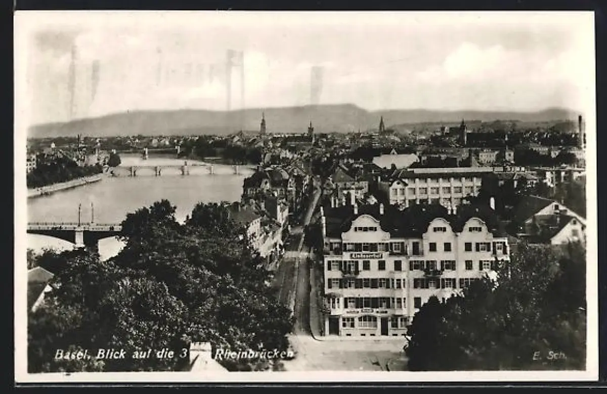 AK Basel, Blick auf die 3 Rheinbrücken, Gasthof Elsässerhof