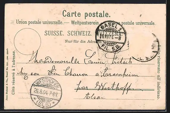 gelaufen 1904, Briefmarke entfernt, rückseitig Oberflächenschaden, guter Zustand