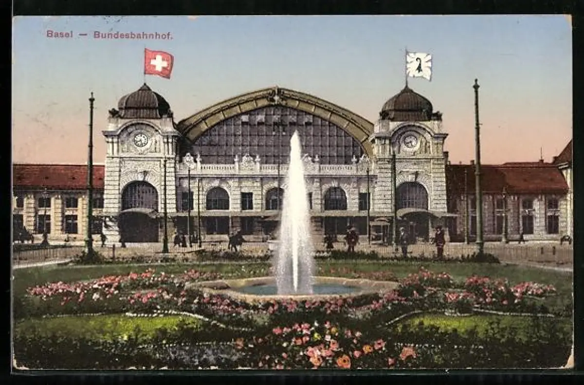 AK Basel, Bundesbahnhof mit Springbrunnen