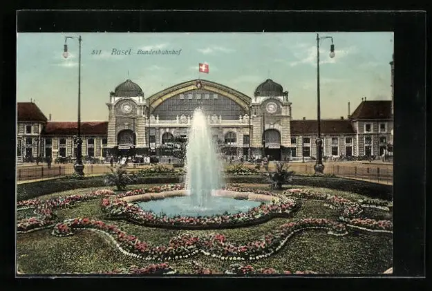 AK Basel, Hauptbahnhof mit Springbrunnen
