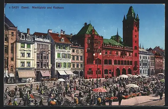AK Basel, Marktplatz mit Rathaus und Kaffeerösterei F. Riggenbach