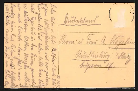 Personenbezogene Daten auf der Rückseite der Karte wurden durch blauen Textmarker unkenntlich gemacht. Die blauen Stellen sind auf die Vorderseite durchgeweicht und wirken sich negativ auf das Postkartenfoto aus