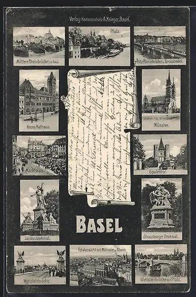 AK Basel, Münster, Spalentor, Marktplatz, Jacobsdenkmal, Strassburger Denkmal, Wettsteinbrücke