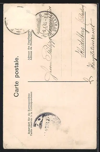 alte Ansichtskarte, gelaufen 1905, Briefmarke entfernt, rückseitig Oberflächenschaden, Eckknick re. unten, guter Zustand