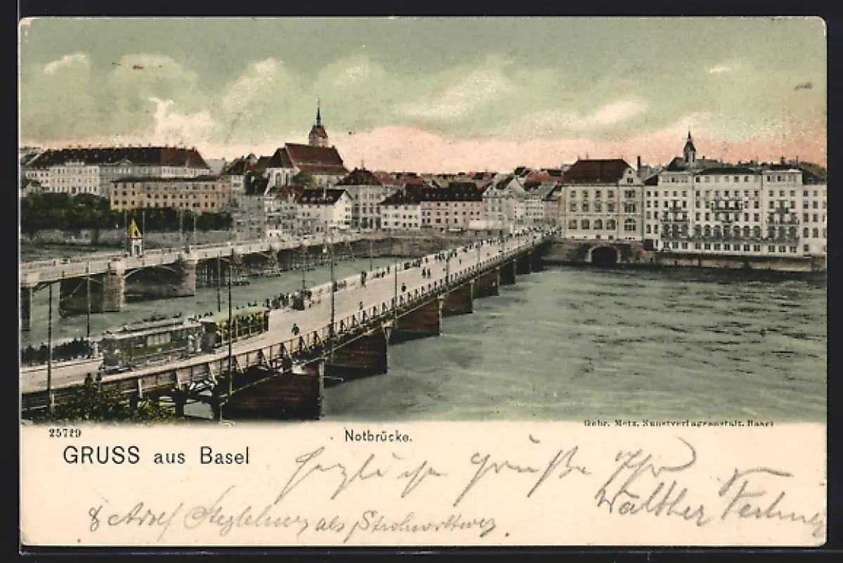 AK Basel, Notbrücke mit Strassenbahn