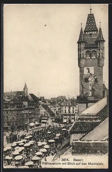 AK Basel, Rathausturm mit Blick auf den Marktplatz