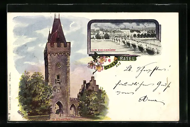 AK Basel, St. Albantor, Alte Rheinbrücke